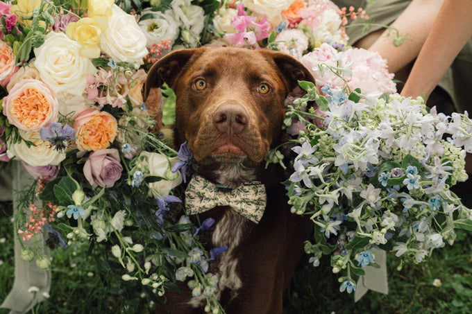Meet Moose! The goodest boy and best flower pup at Jen & Erin’s stunning wedding day. Dressed to impress in our Olive You bow tie, he took his role very seriously… right down to posing perfectly among the blooms.